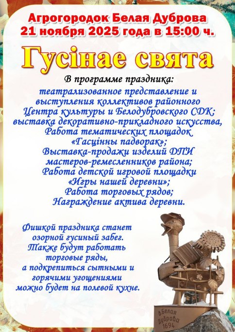 Ярким моментом праздника является знаменитый аттракцион «Гусиные бега» и обряд «Деление гуся», а дегустация запеченного гуся проходит по старинной доброй традиции с добрыми пожеланиями от гостей праздника.Для жителей деревни и гостей праздника будет организована работа «Полевой кухни», где все желающие смогут бесплатно отведать вкусную кашу, уху и выпить горячего чая.
